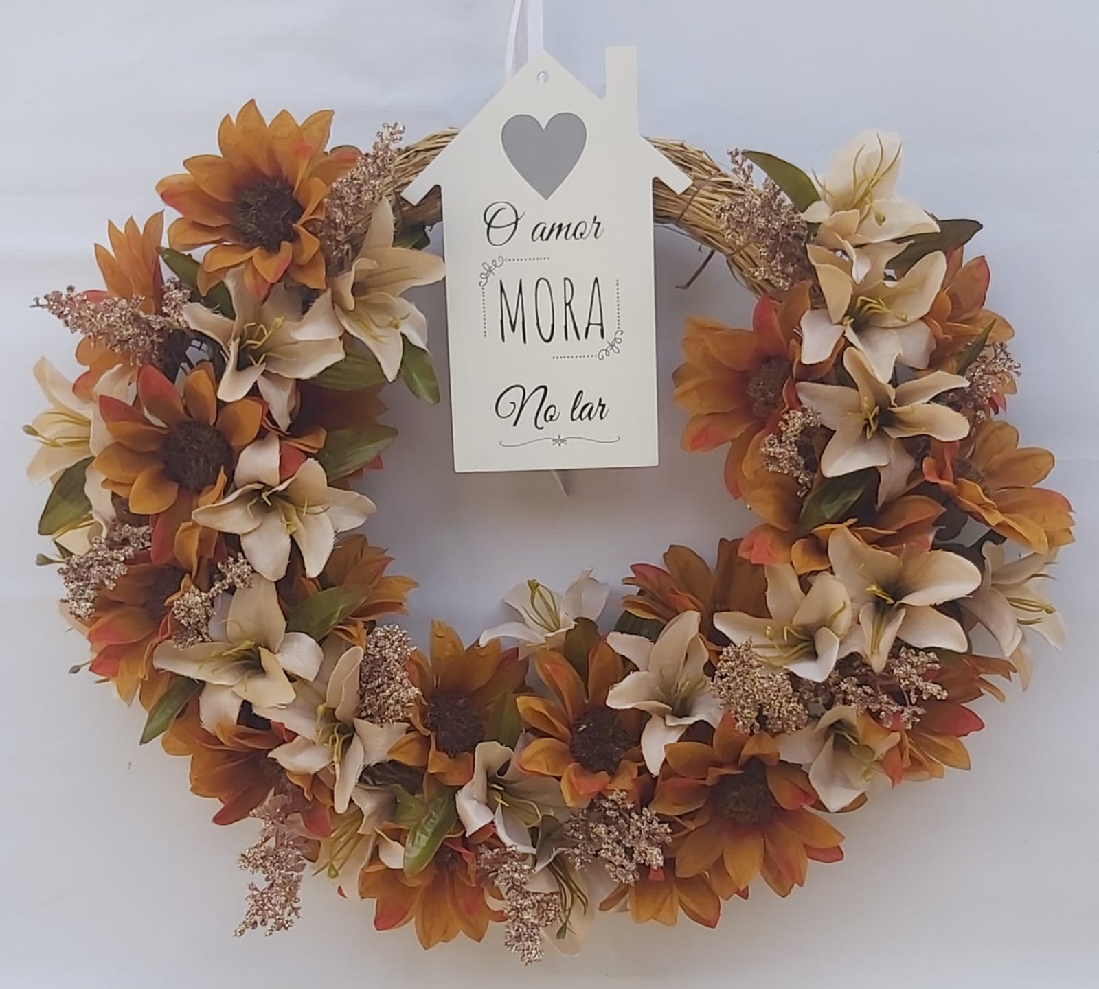 Guirlanda de palha com 40cm de diâmetro coberta por mini girassóis, lírios e gypsos, no topo uma placa em mdf branca com dizer: "O amor mora no lar".
