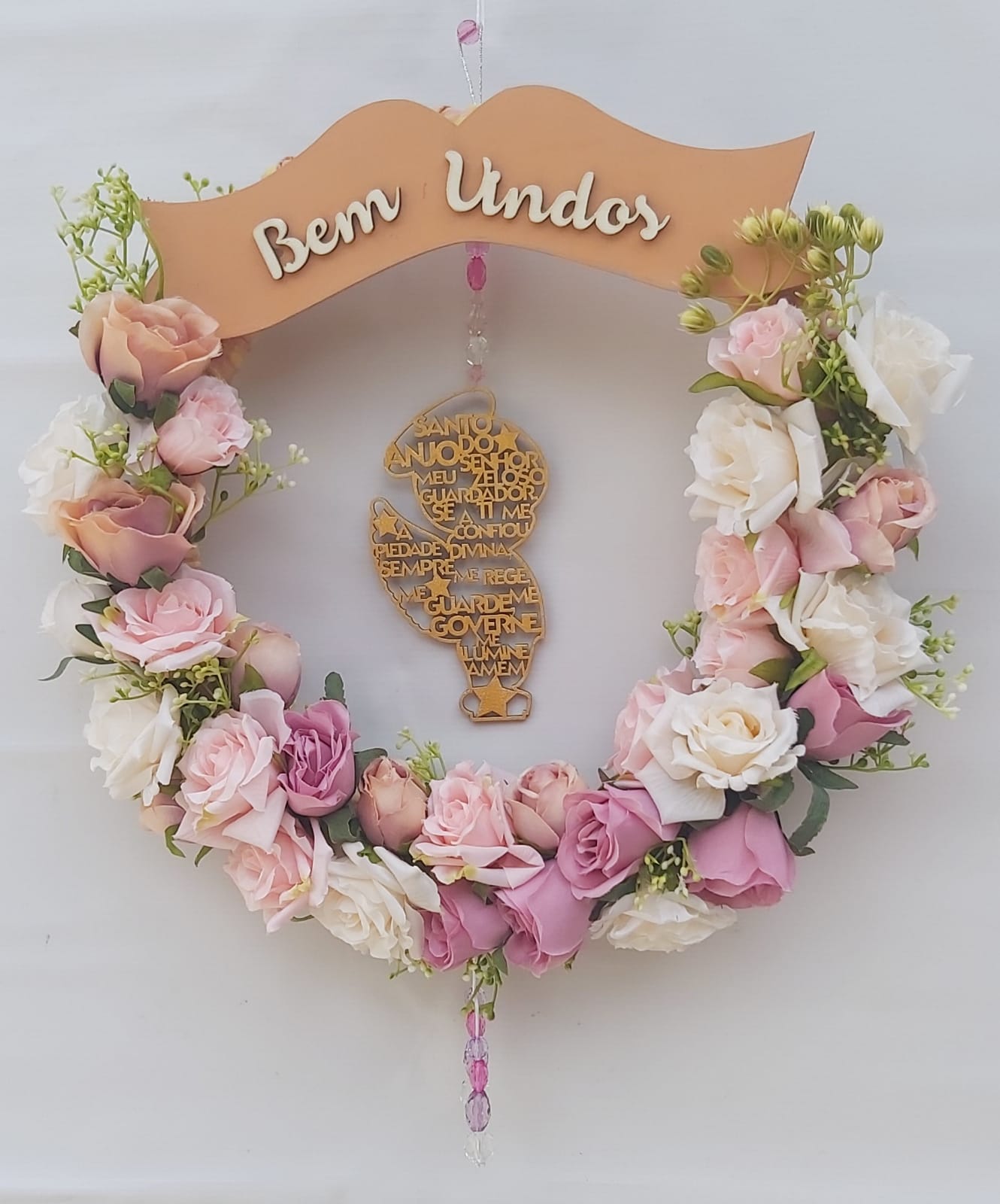 Guirlanda de palha com diâmetro de 40cm forrada com fita nas cores rosa e verde, rosas médias nas cores branca, rosa claro, escuro e salmão, botões de rosas, no topo placa com letreiro na cursiva ¨Bem Vindos¨, no interior em mdf a oração do Santo Anjo na imagem de um anjo, na base fitilho prata com pedras transparente com rosa.