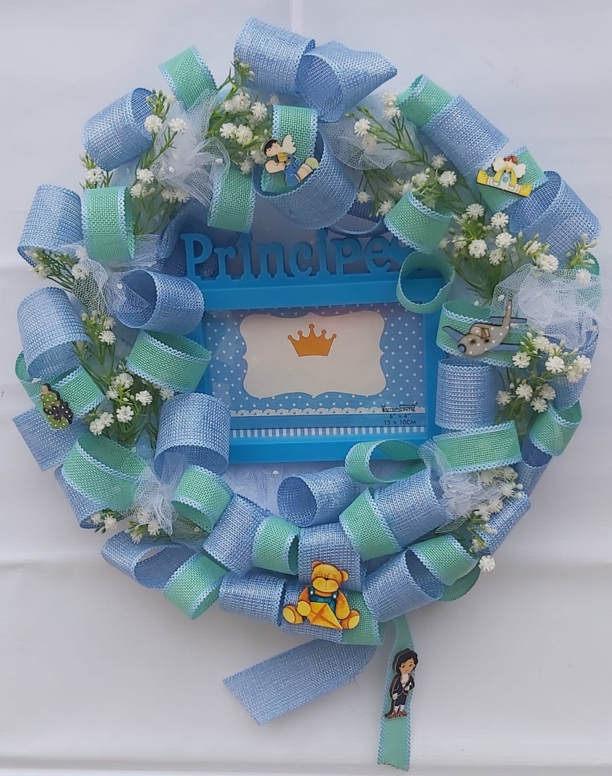 Guirlanda de palha (30cm) com diâmetro de 41cm coberta por fita, composta pela junção de fitas variadas nos tons de azul e verde, onde são fixados pequenos apliques que simbolizam esta fase, no interior está um porta retrato com a palavra “príncipe” destinado a colocação de foto.