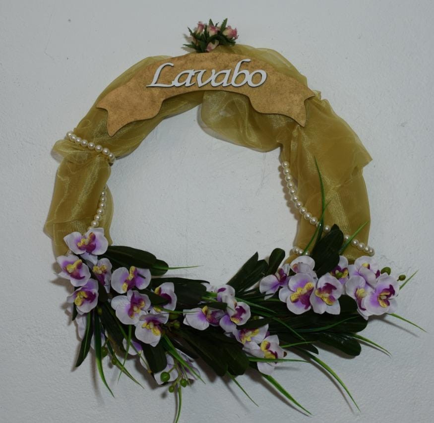 Guirlanda de palha forrada com tecido dourado, flores de orquídeas e pérolas entrelaçadas , medindo 42cm de diâmetro.