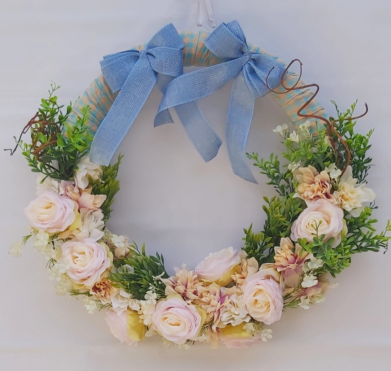 Guirlanda de palha medindo 57cm de diâmetro, coberta por crisântemos e rosas grandes nas cores pastéis, forrada com fita azul e rosa, dois topes no topo na cor azul turquesa.