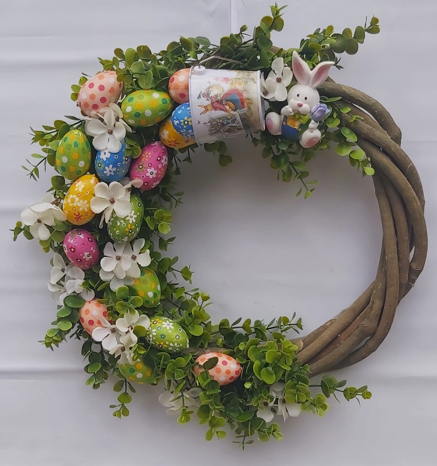 Guirlanda de cipó com 47cm de diâmetro onde parte é coberta por ramos verdes no topo tem um baldinho saindo ovinhos enfeitados com estampas diversas com bolinhas e flores, ao lado do balde está um coelho de cerâmica segurando uma flor.