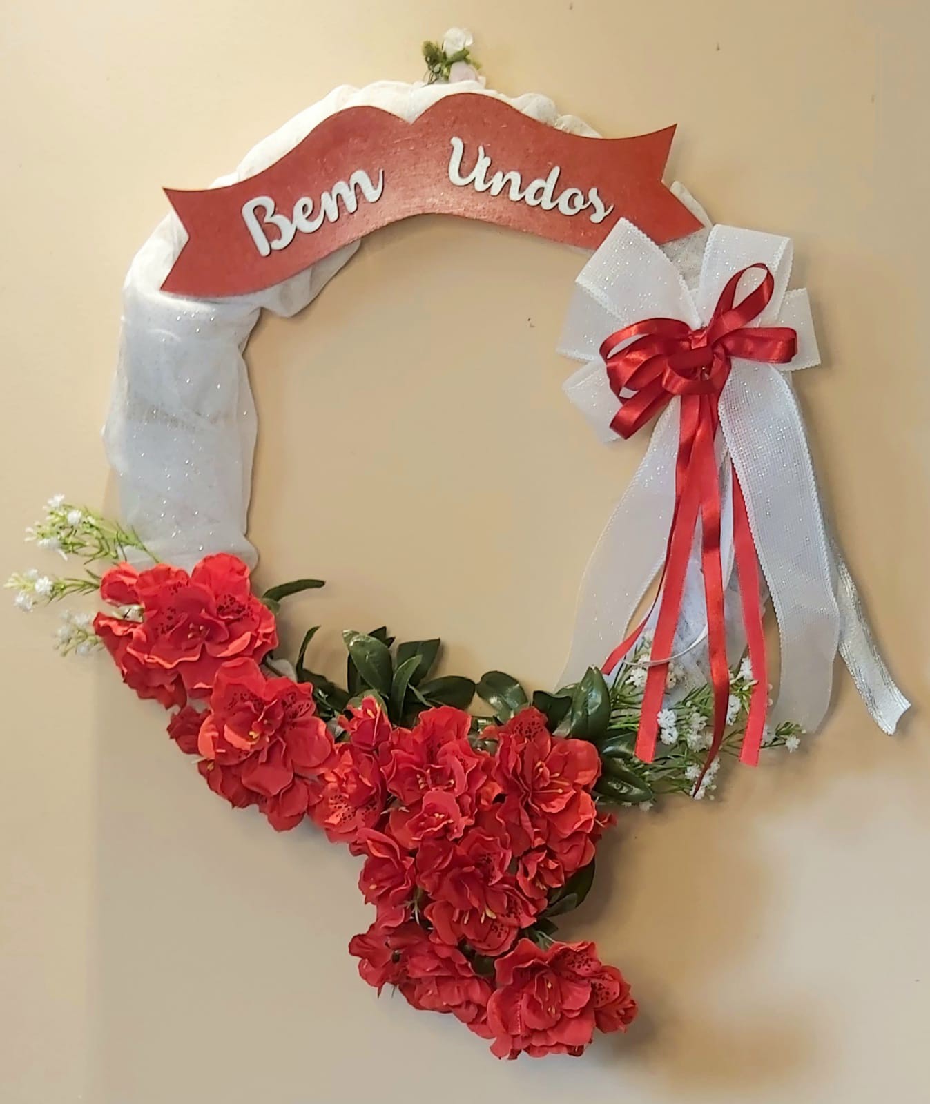 Guirlanda com 51cm de altura e 45cm de largura revestida de tule branco com brilho, flores vermelhas e botões de rosas, tope branco e vermelho, no interior um enfeite pendente com noivos se casando.