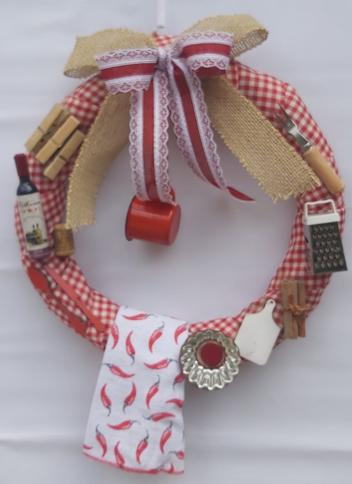 Guirlanda com 49cm de altura e 37cm de largura coberta por tecido xadrez vermelho e branco simbolizando a toalha de mesa, itens simbolizando produtos da cozinha fixados na guirlanda: Canla em casca, ralador, garfo para petisco, grampos para selar pacotes, vinho, rolha, colher, faca, pano de prato, forma de bolo e tábua de carne.