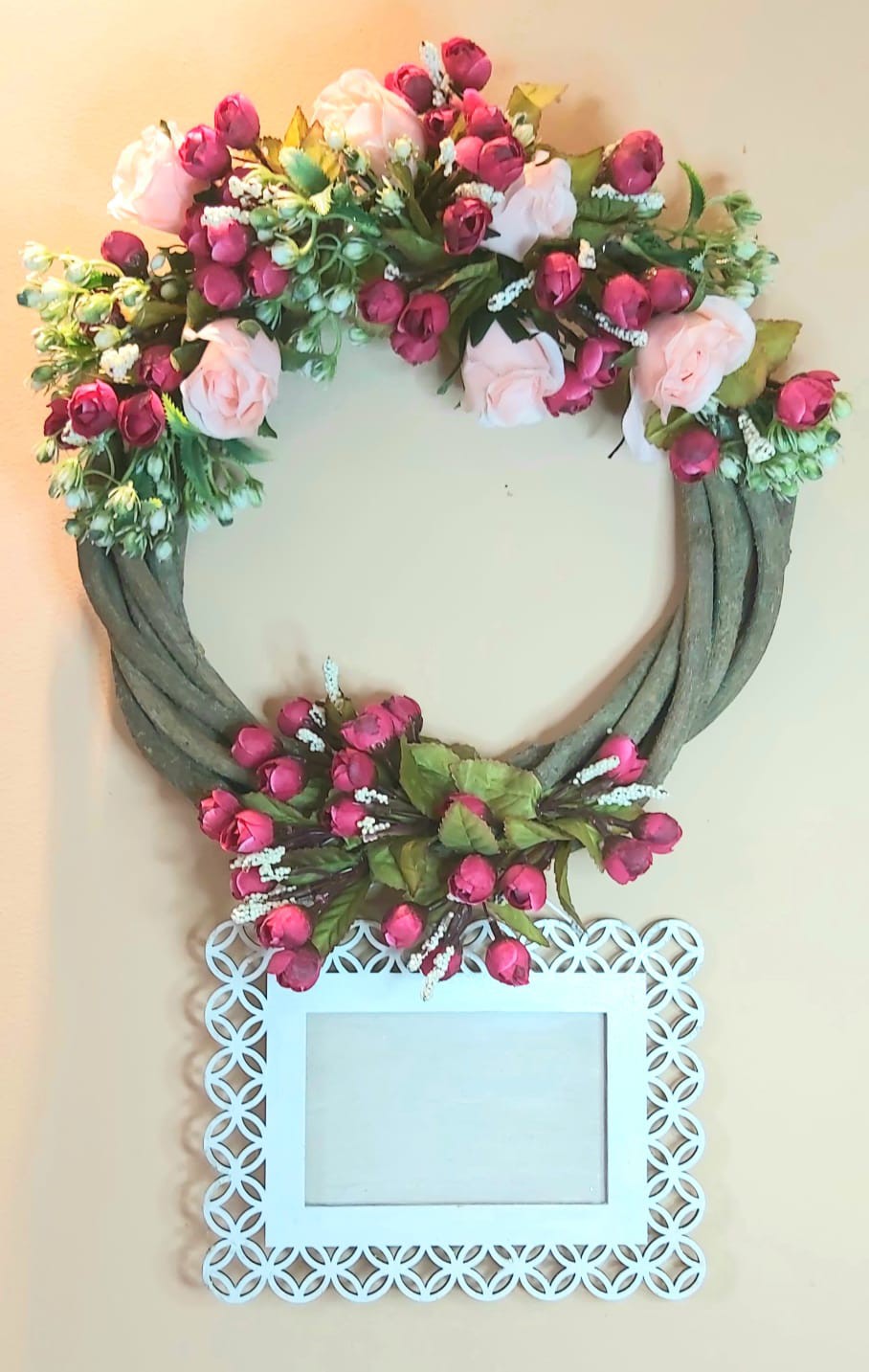Guirlanda de cipó com 56cm de altura e 36cm de largura coberta por rosas e botões de rosas nas cores rosa claro, bordô e brancos. Na base está um porta retrato destinado a colocação de uma foto simbolizando a amizade ou de seu amor.