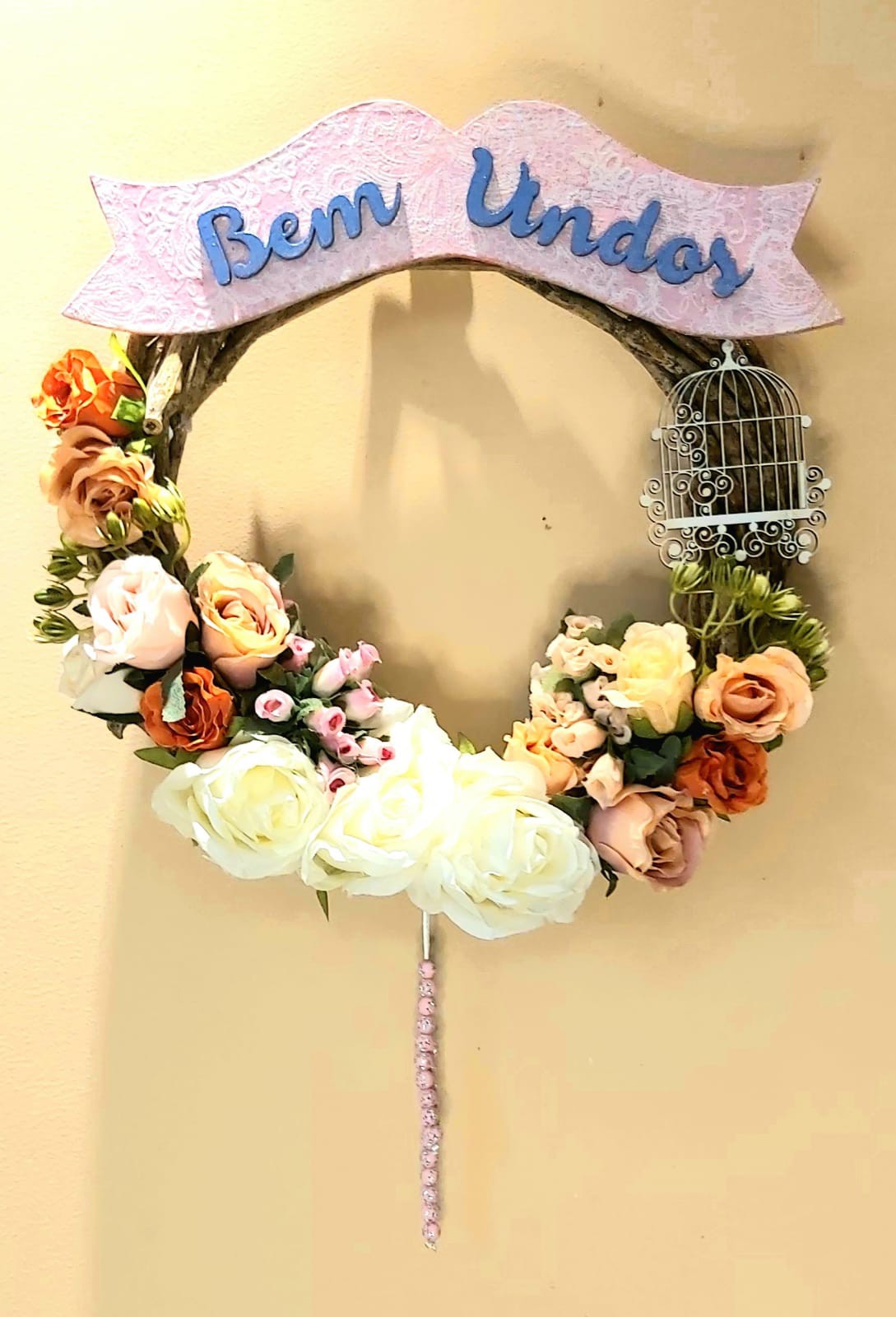 Guirlanda mini de cipó diâmetro de 33cm com rosas médias brancas rosas pequenas nas cores salmão, laranja, rosa, mini rosa lilás, enfeite gaiola em arabesco, no topo placa com letreiro na cursiva ¨Bem Vindos¨, fitilho branco com pedrinhas rosa.