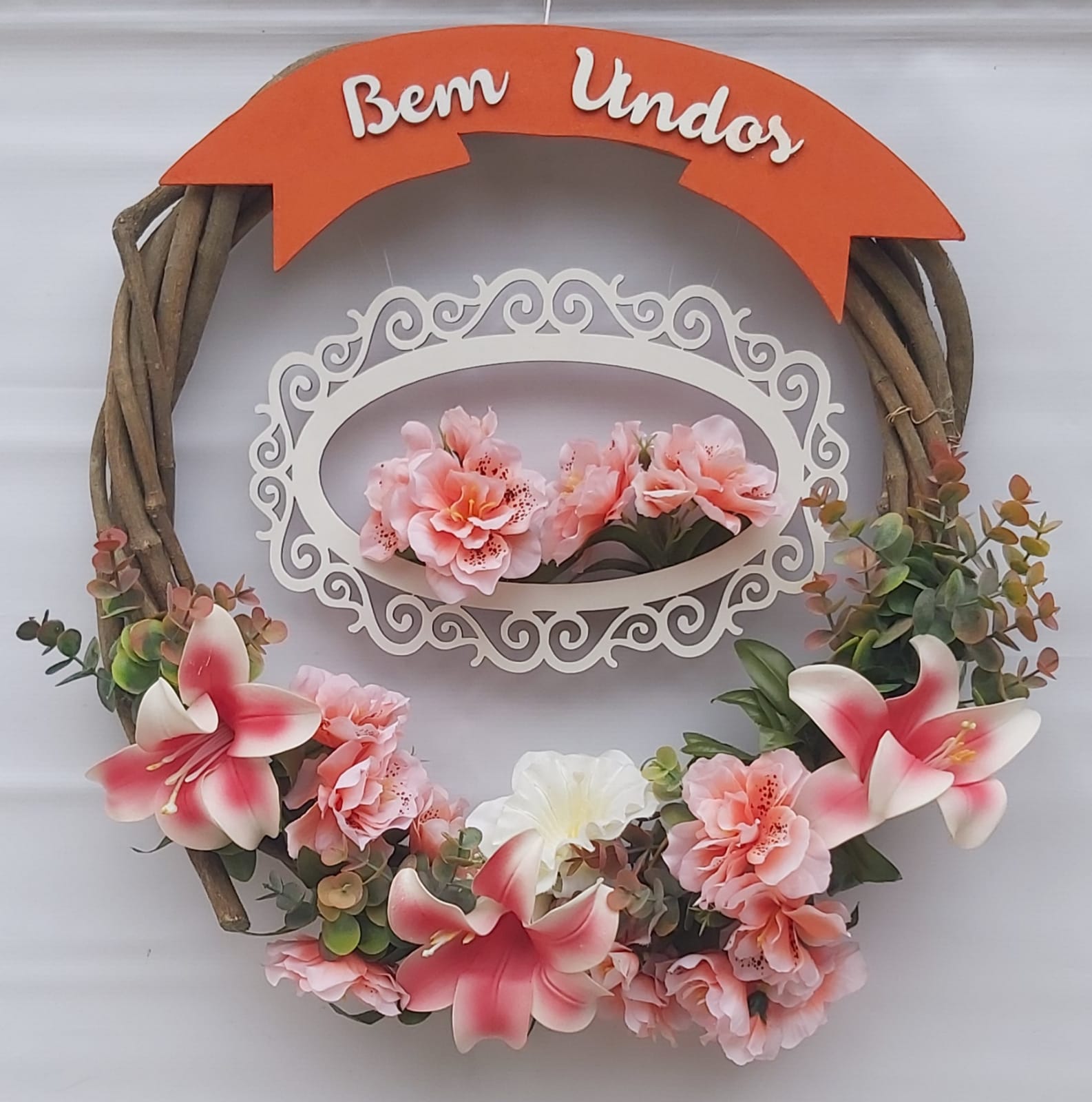 Guirlanda de cipó com 52cm de diâmetro, flores laranja e brancas, no meio está o enfeite em arabesco e flores, placa laranja de “Bem vindos” na escrita cursiva.