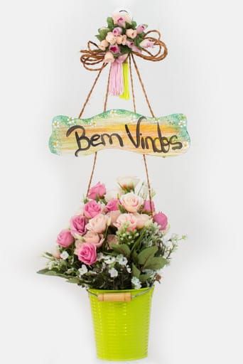 Guirlanda medindo 52 cm de altura e 25 de largura, o vaso possui largura de 10,50cm e altura de 11cm, as flores de rosas brancas e rosas, flores do campo brancas e folhas verdes dentro de um vaso de alumínio na cor verde claro, com arranjo no topo do enfeite com mini rosas fixadas com tope em sisal, anexada placa de ¨Bem Vindos¨.